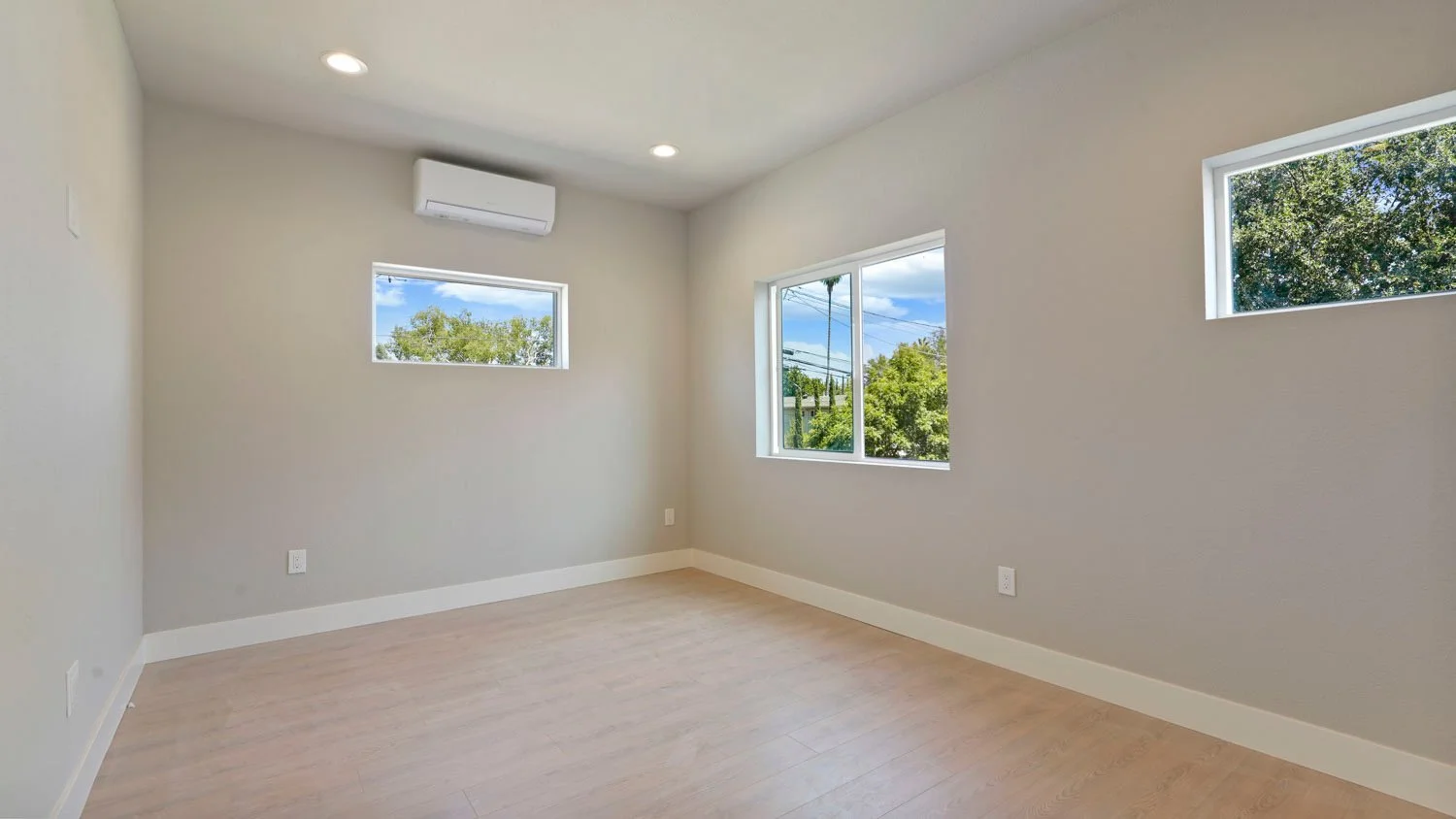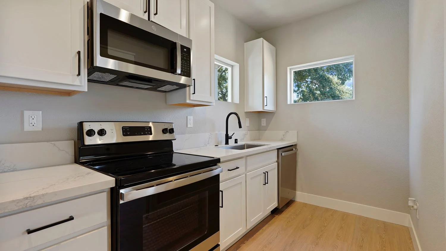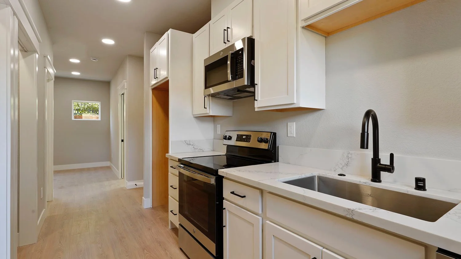 An existing lot with two single-family homes, both fully remodeled. A new two-unit structure was added in the space between, bringing the total to four units on a single lot.